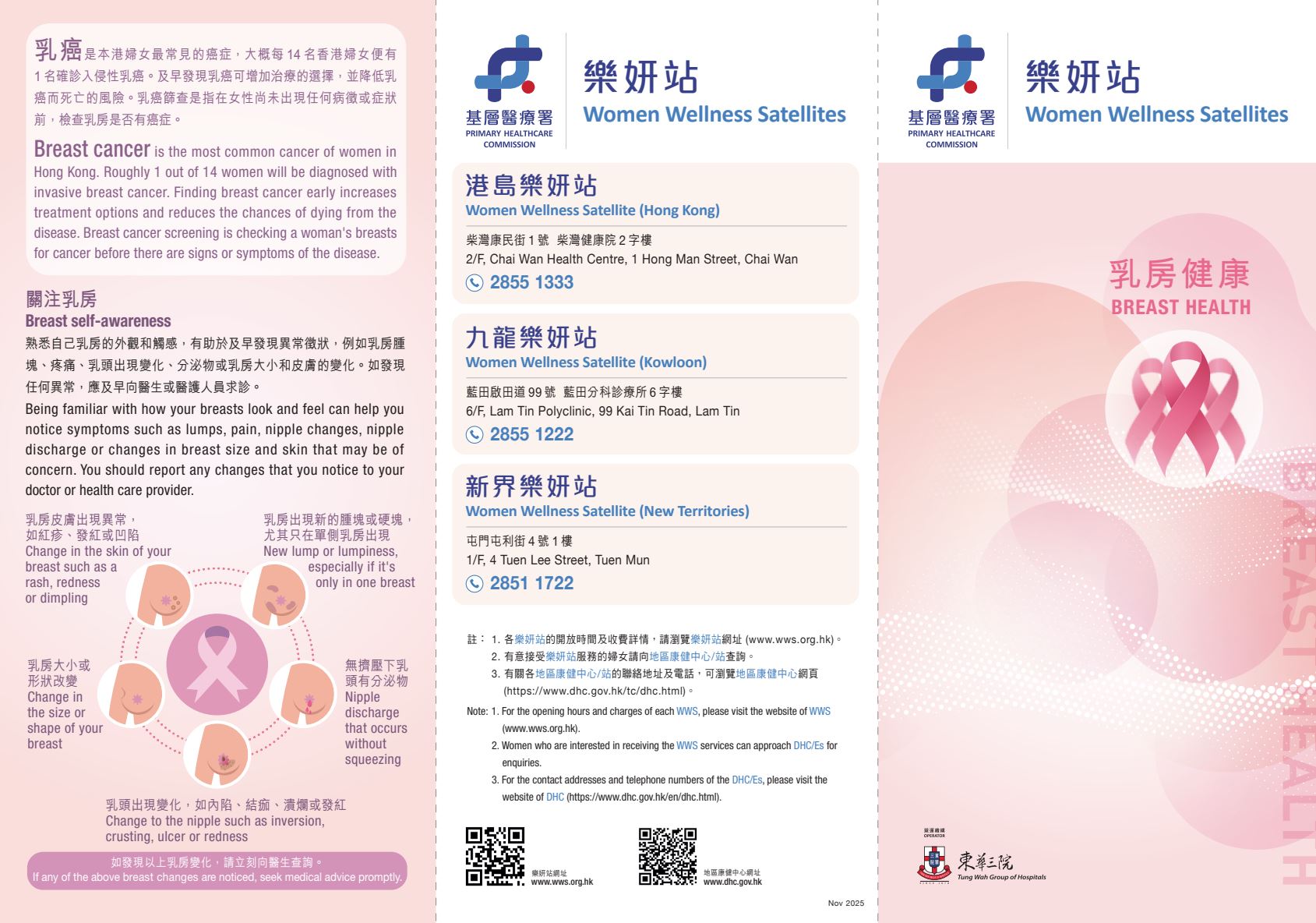 乳癌是本港婦女最常見的癌症,大概每14名香港婦女便有1名確診入侵性乳癌。及早發現乳癌可增加治療的選擇,並降低乳癌而死亡的風險。乳癌篩查是指在女性尚未出現任何病徵或症狀前,檢查乳房是否有癌症。